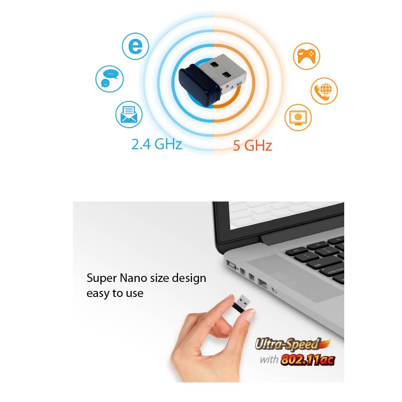 Up to 300Mbps in 2.4GHz and 867Mbps in 5GHz IEEE 802.11a/b/g/n/ac, 2T2R , Super Nano Size
