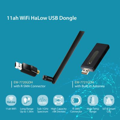 The EW-7720GDH is an IEEE 802.11ah Wi-Fi HaLow USB dongle designed for long-range and low-power wireless communication. Operating in the sub-1GHz 900 MHz spectrum, it delivers superior signal penetration and wide-area coverage compared to traditional Wi-Fi. With transmission distances of up to 1.5 km, it is ideal for smart city infrastructure such as street facilities, public surveillance, parking systems, and environmental sensors deployed across wide outdoor areas.
