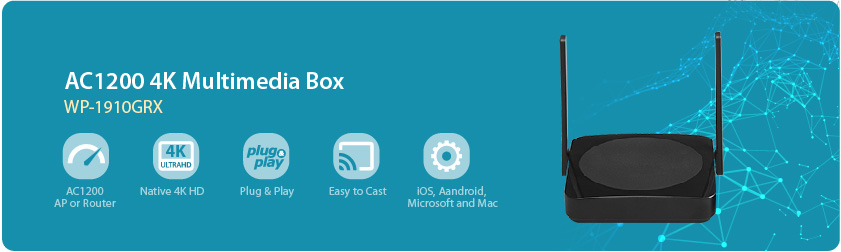The WP-1910GRX Wireless Projection System series offers efficiency and creativity with unprecedented 4K HD wireless multimedia solution for mirror and cast using . Unique features such as BYOD multi-device, multi-platform and dual-way interactive connectivity that brings next-gen presentation methods to reality.